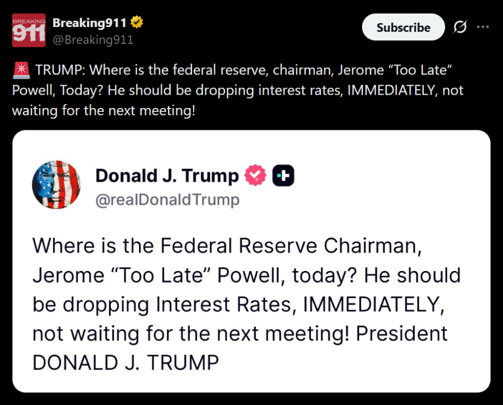 Amid the market turmoil, President Donald Trump publicly criticized Federal Reserve Chairman Jerome Powell. In a social media post, Trump referred to the Fed chair as “Jerome Too Late Powell” and urged the central bank to immediately reduce interest rates instead of waiting for the next policy meeting.