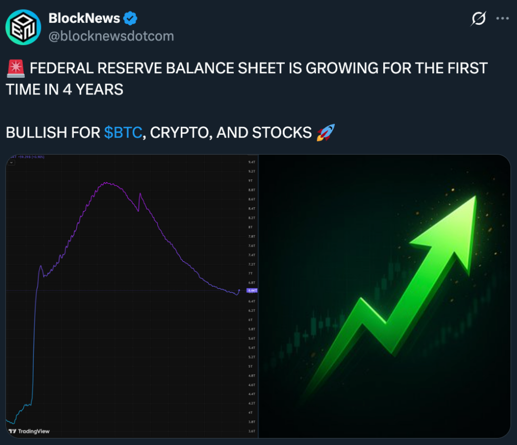 What makes this shift notable is that it puts liquidity back on the table as a driver, independent of interest rate policy. Markets don’t just trade on the price of money, they trade on its availability. A growing balance sheet signals that the era of relentless drain may be ending, even if cautiously. That alone can lift sentiment across equities and risk assets.