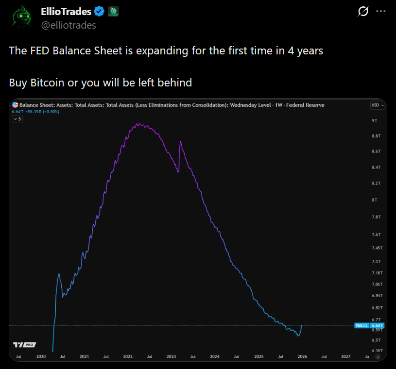 Bitcoin and broader crypto markets have shown a strong relationship with liquidity cycles. When the Fed was shrinking its balance sheet aggressively, crypto struggled and internal stress showed up in price structure. If balance sheet expansion becomes sustained rather than temporary, that dynamic can flip. Bitcoin’s sensitivity to liquidity means its beta often turns positive when reserves grow, even before rate cuts enter the conversation.