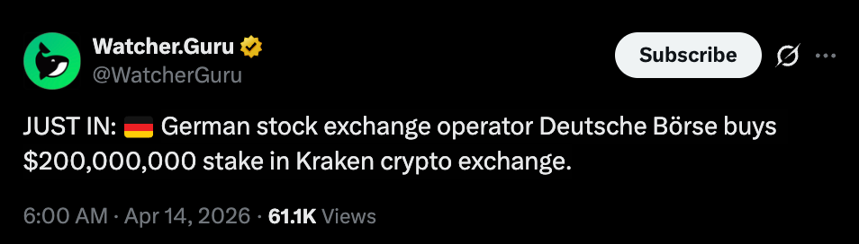 - Deutsche Börse invested $200M for a 1.5% stake in Kraken
