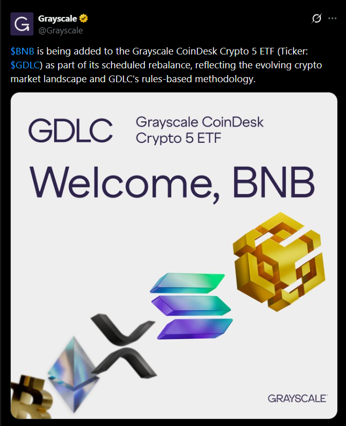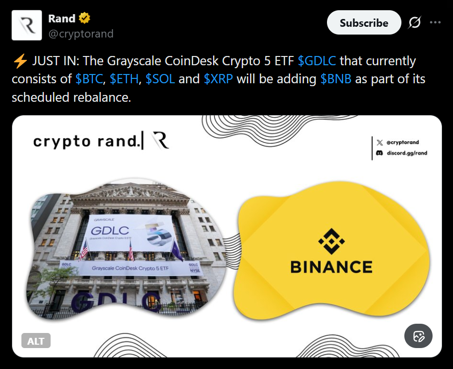 - Grayscale’s CoinDesk Crypto 5 ETF replaced Cardano with BNB