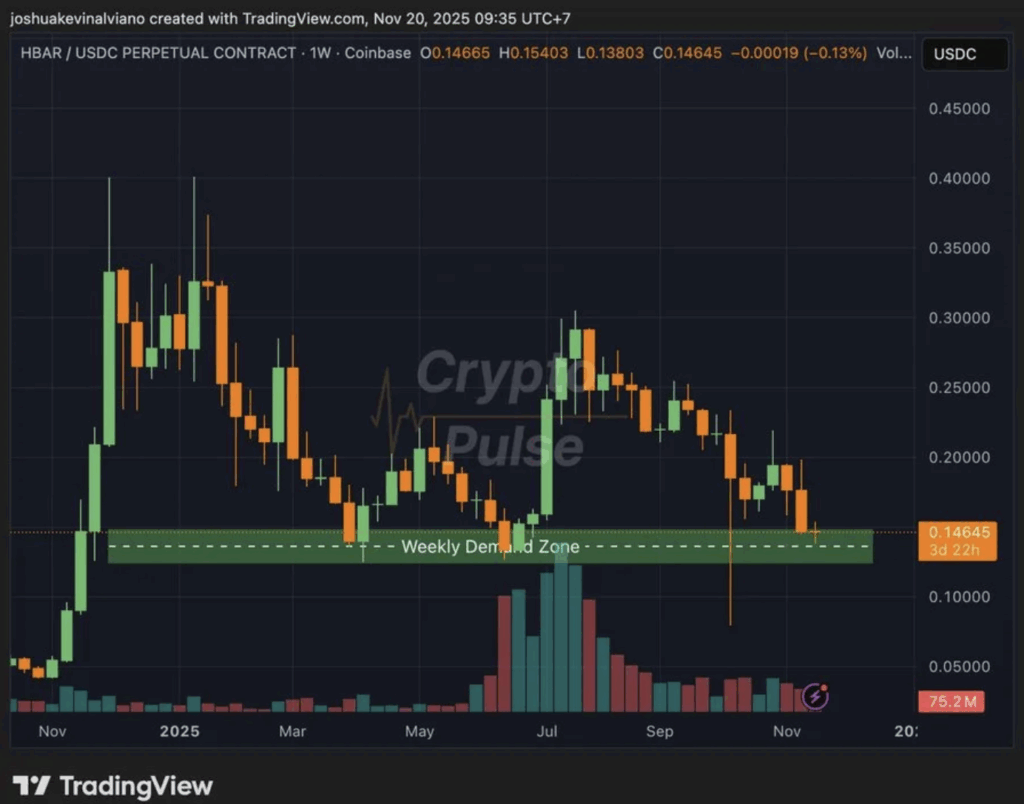 CryptoPulse, a well-followed market analyst, highlighted that HBAR is resting right on its weekly demand zone—basically a spot where buyers have historically stepped in with some force. This area has acted as a launchpad for multiple reversals in the past, making it a key zone to defend. Unless HBAR slips beneath this base, the analyst believes the token could head back toward the $0.17 to $0.19 range. But a weekly close under $0.12 would flip that entire structure bearish, potentially opening the door for deeper declines that could unravel the momentum Hedera built earlier this year. It’s one of those moments where small price moves matter more than usual.