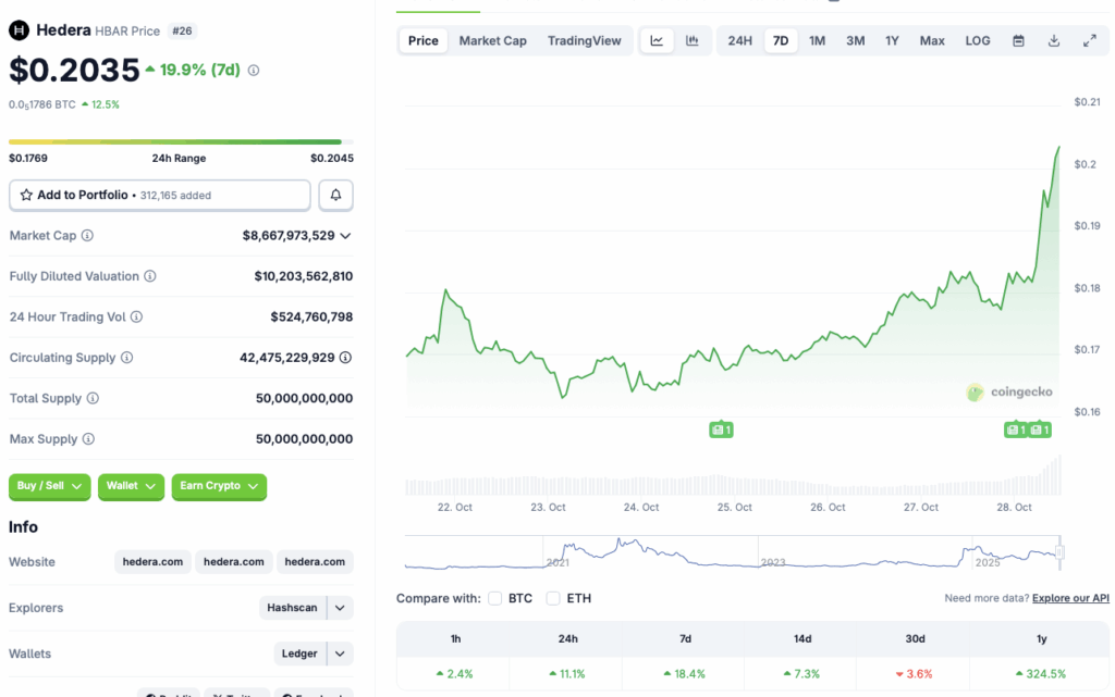 While most of the crypto market trades lower, Hedera (HBAR) is rallying sharply after confirmation that the Canary Hedera ETF will officially launch today, Oct. 28, 2025. Data from CoinGecko shows HBAR has jumped 11.1% in 24 hours, 18.4% this week, and an incredible 324% year-over-year since October 2024. The surge stands out as Bitcoin and other majors slip — with BTC falling 1.7% to $113,000 — signaling strong investor excitement over new institutional exposure through the ETF listing.