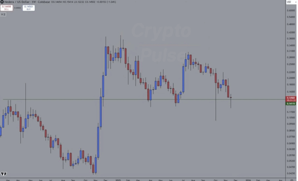 CryptoPulse broke down the weekly chart, pointing out the long lower wick — a little sign with a big meaning. That wick shows buyers didn’t just dip their toes… they stepped in aggressively when sellers tried to drive the price lower. The late-week recovery pushed HBAR off the floor and helped form one of its strongest closes in weeks.