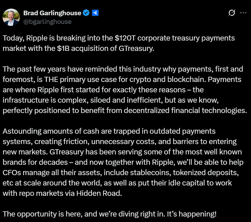 This acquisition underscores Ripple’s ongoing pivot beyond payments and into broader financial services. The company’s infrastructure — which spans payments, crypto custody, and stablecoin management — is now evolving into a full-service financial ecosystem. Ripple says it aims to use blockchain to cut operational costs and increase efficiency across institutional finance. The move also strengthens the real-world utility of XRP, integrating it directly into the backbone of Ripple Prime’s ecosystem.