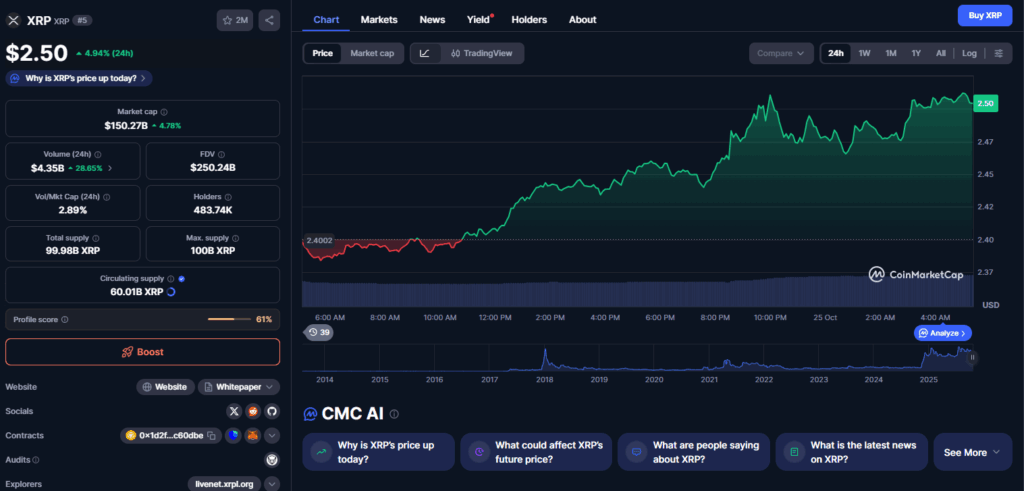Ripple just pulled off one of its biggest moves yet — completing its acquisition of global prime broker Hidden Road in a $1.25 billion deal. Now rebranded as Ripple Prime, the acquisition marks a major shift for Ripple as it steps deeper into institutional finance. Following the announcement, XRP surged to around $2.50, gaining 5% on the day and 8% over the week, bouncing back from last week’s broader market dip. With a market cap north of $148 billion, XRP remains the fifth-largest cryptocurrency globally, showing renewed investor confidence.