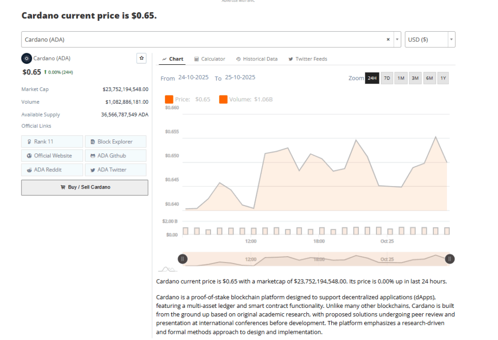 Cardano’s price action has been quietly tightening for weeks, forming a structure that traders believe could soon explode into motion. Currently trading near $0.65, ADA has been grinding sideways, respecting a long-term wedge pattern that’s been in play for years. Market watchers suggest that as price compresses near key support levels, the odds of a breakout toward higher targets are climbing fast — with $0.68 emerging as the key trigger zone to watch.