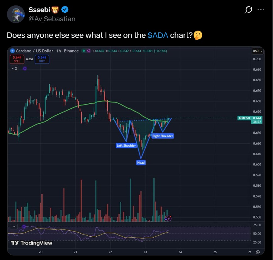 • Cardano is consolidating within a multi-year wedge, nearing a $0.68 breakout point.