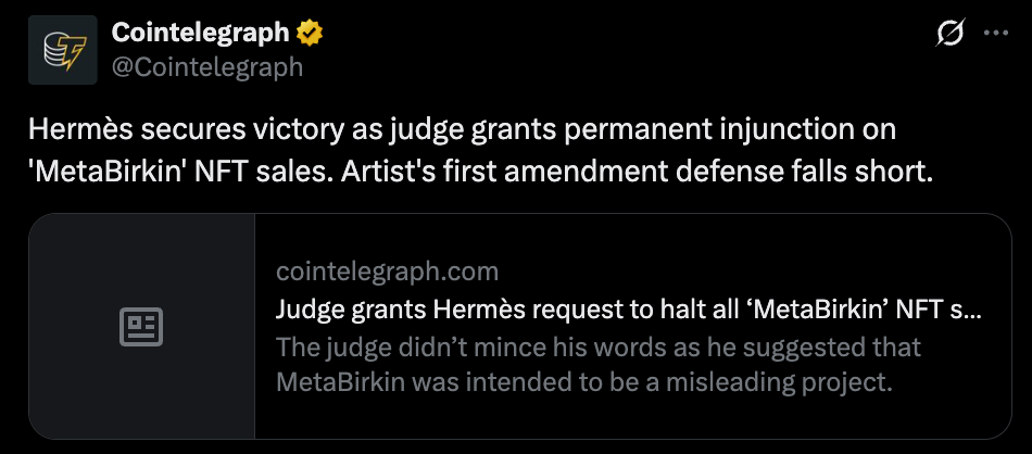 The Hermès vs. MetaBirkin case just did something the NFT market has been quietly avoiding for years. It put a price—and a precedent—on what happens when real-world IP collides with tokenized assets.