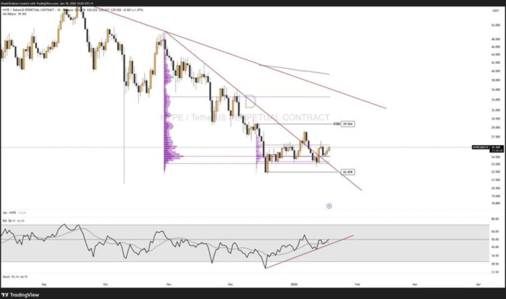 • HYPE is consolidating between $24.6 and $26.26, signaling balance rather than trend