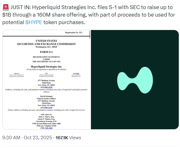 Hyperliquid Strategies officially filed with the U.S. SEC to raise up to $1 billion through a new equity offering. The company plans to issue roughly 160 million common shares under a committed equity facility with Chardan Capital Markets. Funds will be used to reinforce its balance sheet and fuel the HYPE token acquisition plan.