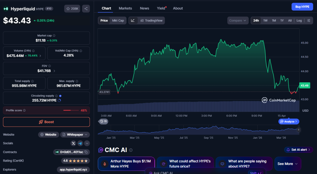 Hyperliquid’s HYPE token is heating up again, climbing toward the $45 level and marking its strongest recovery in months. After bottoming earlier this year, the token has pushed more than 20% higher over the past week, briefly touching a five-month high before settling slightly lower. It’s a sharp move, and not just random price action either.