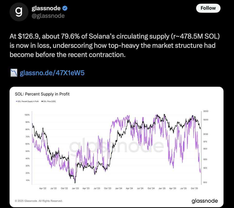 The deeper story here is that Forward Industries isn’t alone in this mess. Glassnode data shows 79.6% of Solana’s supply is now held at a loss — that’s almost 478.5 million SOL underwater. This confirms what everyone already suspected: the market was top-heavy, with too many buyers piling in near the highs.