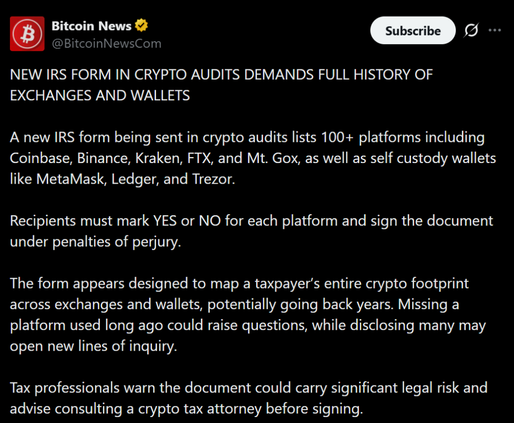 The IRS is tightening its grip on cryptocurrency taxation, and recent audit practices suggest the agency is becoming far more aggressive in tracking digital asset activity. According to reports shared among tax professionals, some crypto investors under audit are now receiving detailed questionnaires asking them to disclose every exchange and wallet they have ever used.