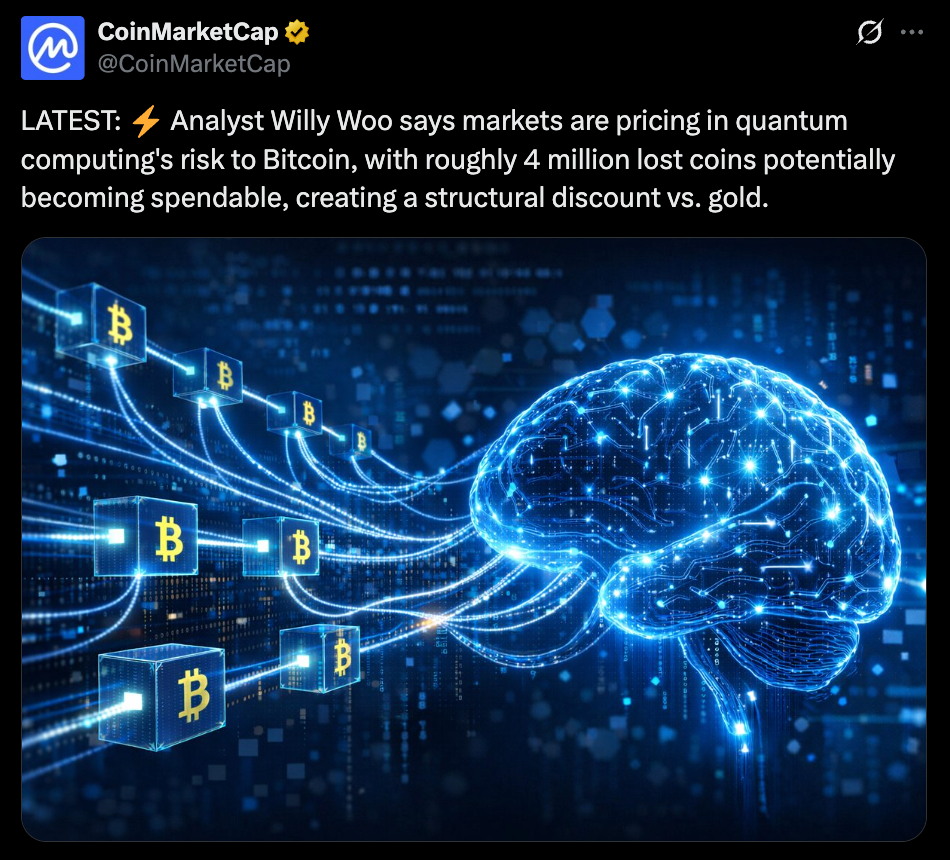 The idea sounds almost futuristic, but it’s starting to creep into serious market discussions. Analyst Willy Woo argues that Bitcoin may already be trading with a subtle discount because of quantum computing risk. If quantum machines advance far enough to break older cryptographic address schemes, coins long assumed to be permanently lost could, at least in theory, become spendable again.