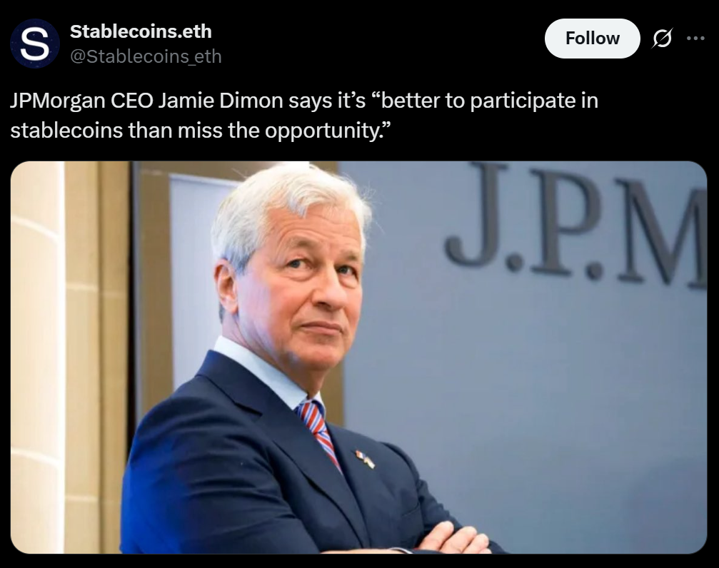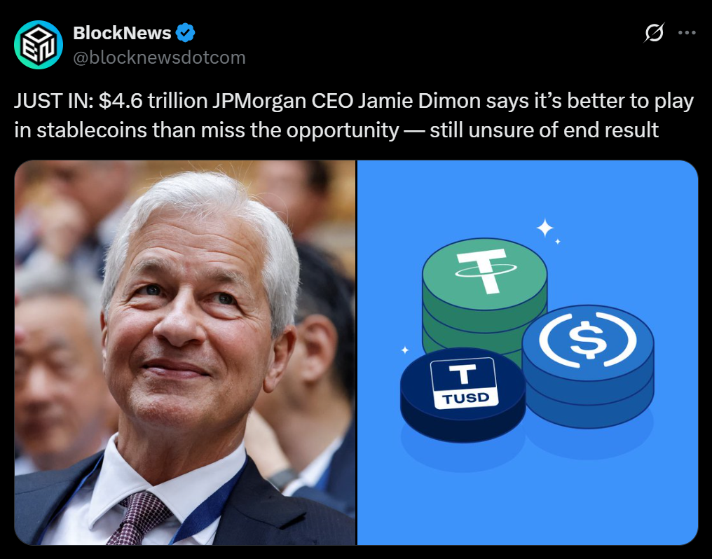 - Jamie Dimon says JPMorgan is developing a stablecoin, potentially with other banks.