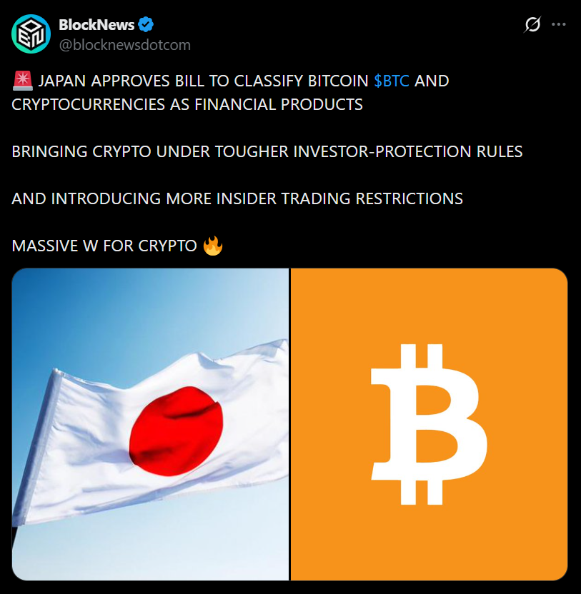 - Japan approved a bill to treat crypto like stocks and bonds