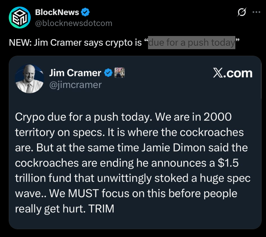 CNBC’s Jim Cramer lit up X on Tuesday with a warning that crypto markets are “due for a push” — but compared today’s rally to the dot-com bubble of 2000, urging investors to trim exposure before “people really get hurt.” In his post, Cramer wrote, “Crypto due for a push today. We are in 2000 territory on specs.” He likened the current speculative mania to the peak of early internet stocks, calling the market “where the cockroaches are.”