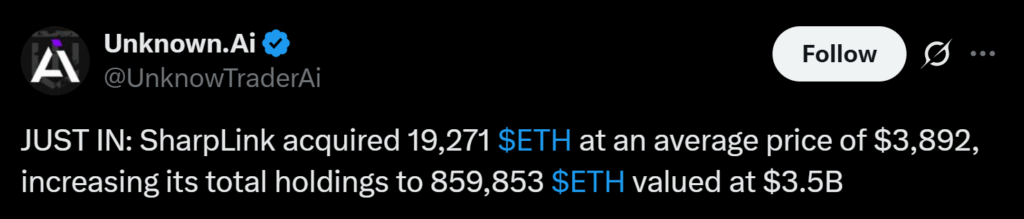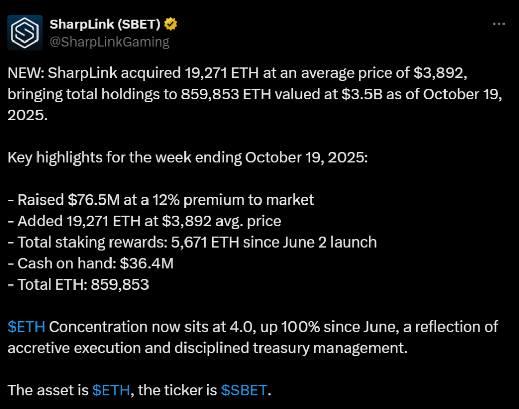 Sharplink Gaming (SBET), the Nasdaq-listed digital asset treasury firm led by Ethereum co-founder Joe Lubin, has resumed Ether accumulation after a month-long pause. The company purchased 19,271 ETH for roughly $75 million, marking its first buy since August. The move brings Sharplink’s total holdings to 859,853 ETH, worth over $3.5 billion, alongside $36.4 million in cash reserves. The average acquisition price for the new batch came in around $3,892 per ETH, according to the firm’s latest filing.