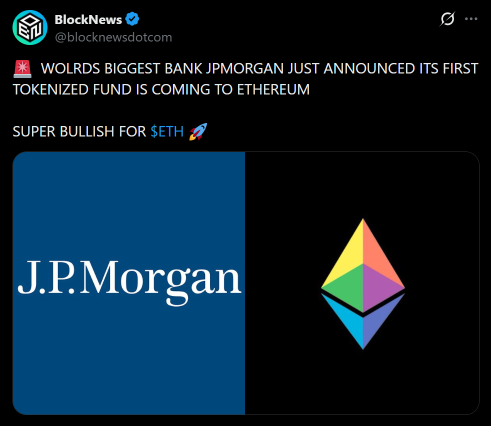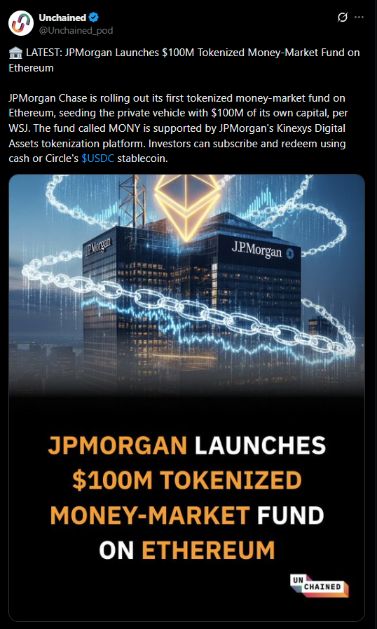 - JPMorgan launched its first tokenized money market fund, MONY, on Ethereum with a $100M seed.