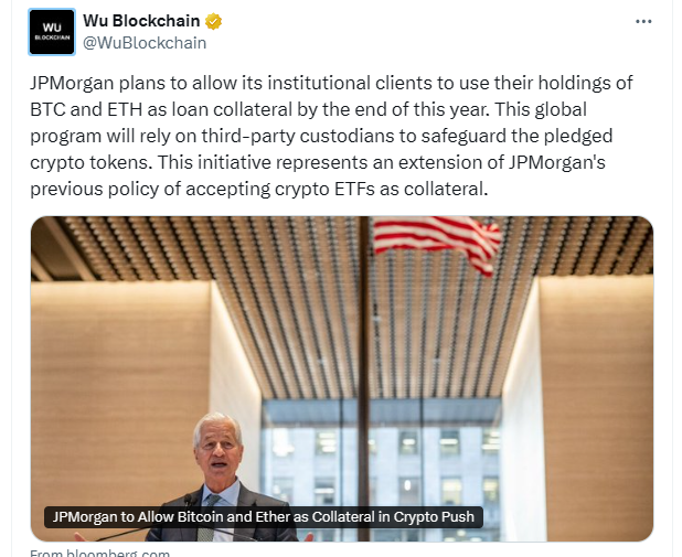 - JPMorgan will allow institutional clients to use Bitcoin and Ethereum as collateral for loans by the end of 2025.