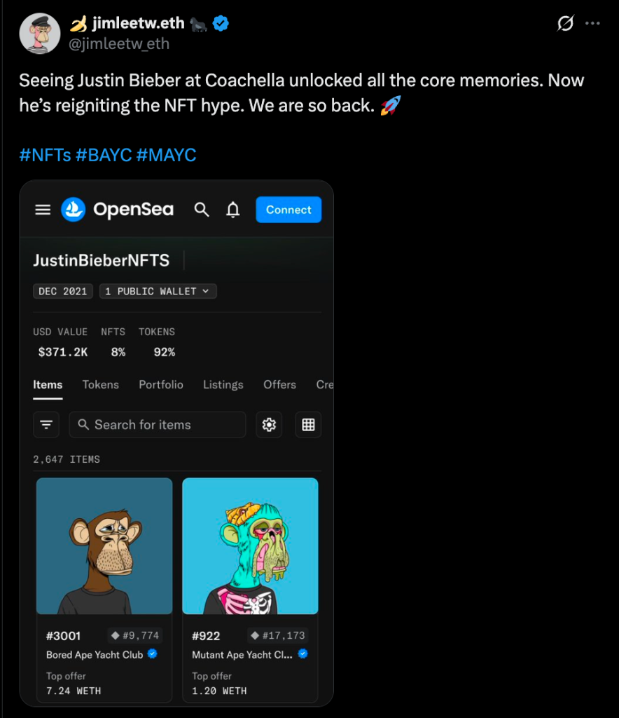Bieber’s return triggered more than just music streams, it brought back a wave of nostalgia, especially among the NFT crowd. For some, it’s genuine excitement, a reminder of when culture and crypto felt tightly linked.