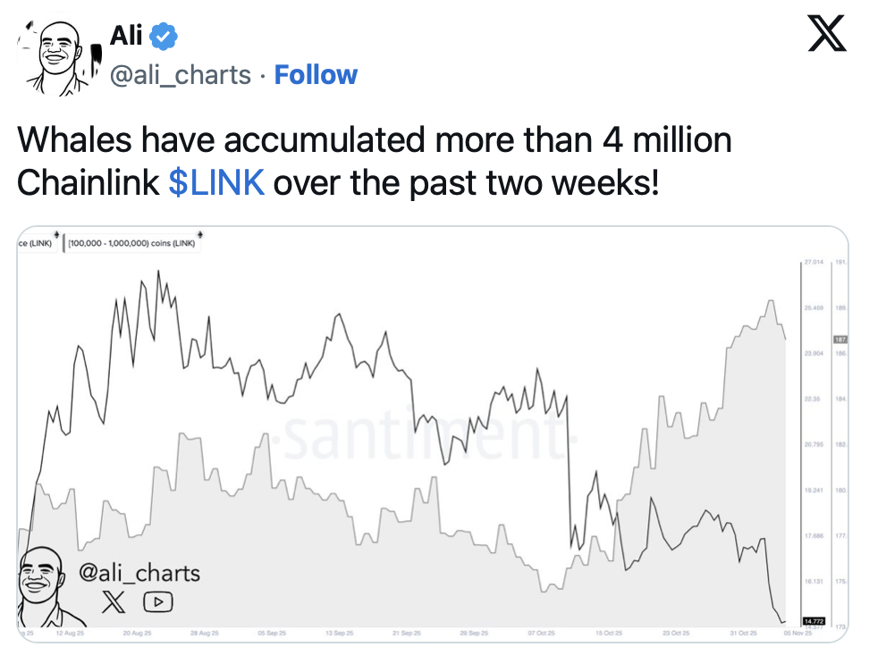 While smaller holders offload their bags, whales are doing the exact opposite. According to on-chain analyst Ali, large wallets accumulated over 4 million LINK in the last two weeks alone. This pushed the Exchange Supply Ratio to its lowest level ever.