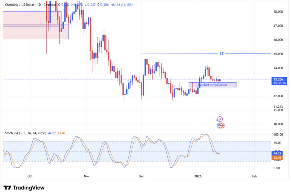 The timing is hard to ignore. LINK recently dipped just enough to fill a long-standing imbalance near the $13 level on the daily chart. Instead of panic selling, the retracement seemed to calm things down. Buyers stepped in quietly, volume stabilized, and price began to move with more purpose. It looked less like a breakdown and more like a necessary reset before the next leg.