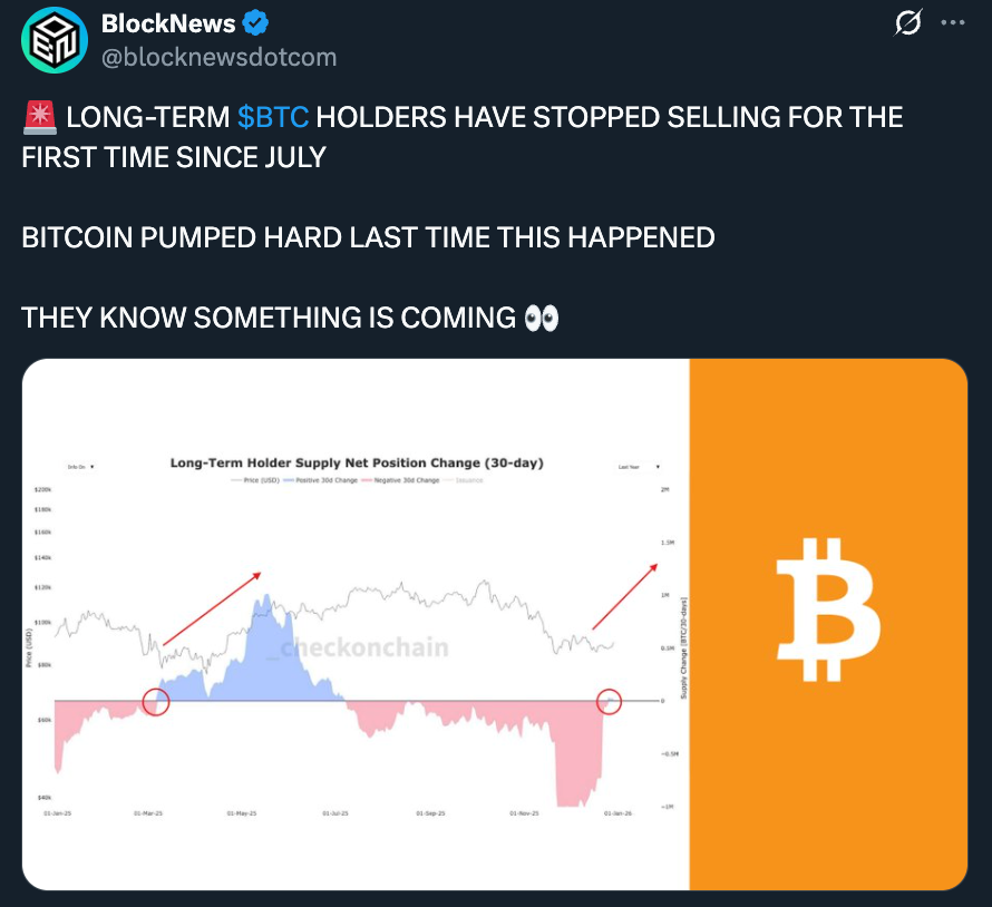 Long-term holders stepping back from selling doesn’t guarantee an immediate breakout. Markets can still chop sideways, and volatility can return quickly. But the signal does suggest growing confidence beneath the surface. With supply pressure easing and history offering a familiar setup, Bitcoin may be entering a phase where upside reactions come more easily than many expect.