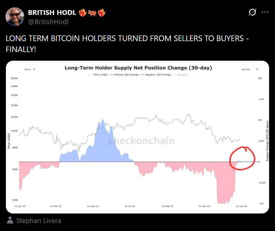 On-chain data is flashing a quiet but meaningful shift. Long-term Bitcoin holders are no longer reducing their positions. The 30-day net change in long-term holder supply has drifted back toward neutral, bringing an end to months of steady distribution. This cohort, typically defined as investors holding BTC for more than 155 days, has historically represented the market’s so-called strong hands.