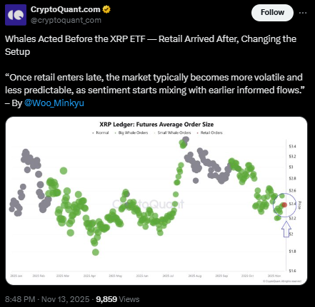 - CryptoQuant detected whales accumulating XRP before the ETF announcement, signaling early positioning.