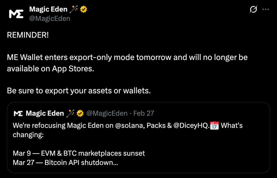 - Magic Eden shuts down its wallet, forcing users to export assets