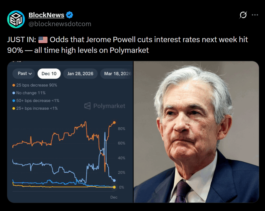 - Markets now price in a ~92% chance of a Fed rate cut next week with no pushback from policymakers.