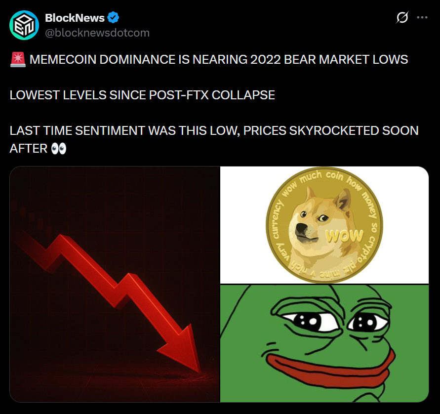 - Meme coin dominance has fallen to multi-year lows as DOGE and SHIB lose momentum