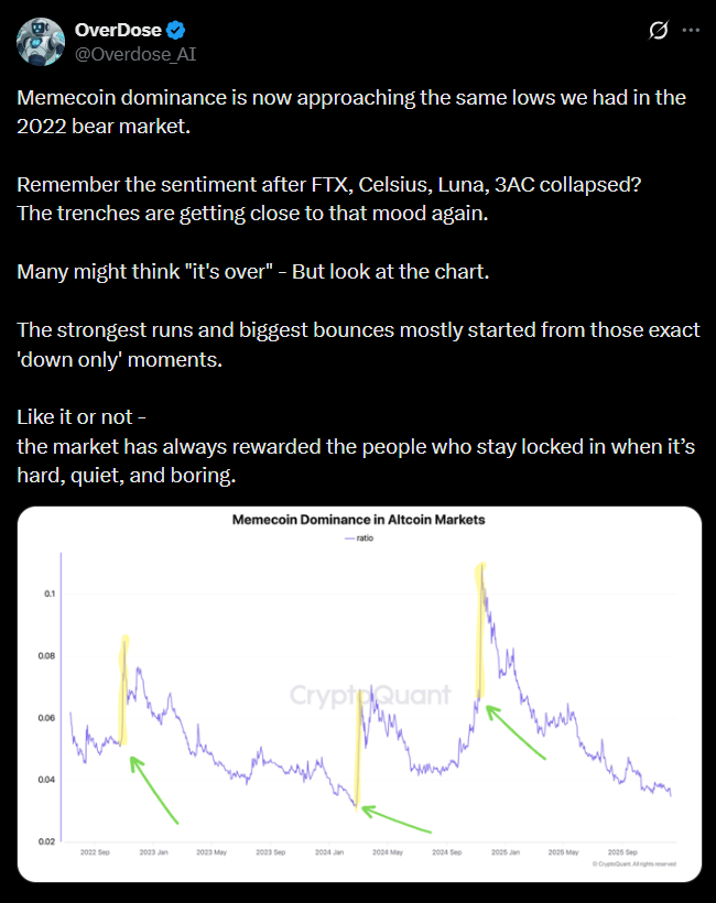 Beyond the top two, the broader memecoin category is seeing declining liquidity and participation. Sector-wide dominance has dropped to multi-year lows, suggesting investors are rotating away from high-beta speculative assets and toward areas perceived as more defensible during uncertain macro conditions.
