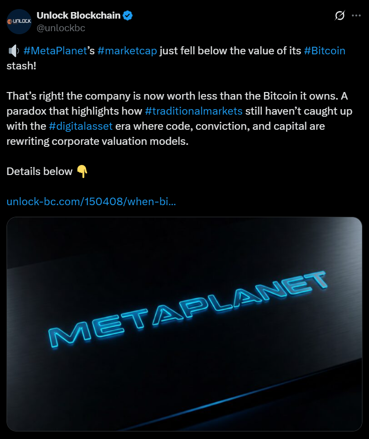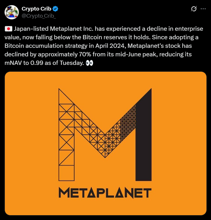 • Metaplanet’s mNAV falls to 0.99, meaning its enterprise value is now below its BTC holdings.