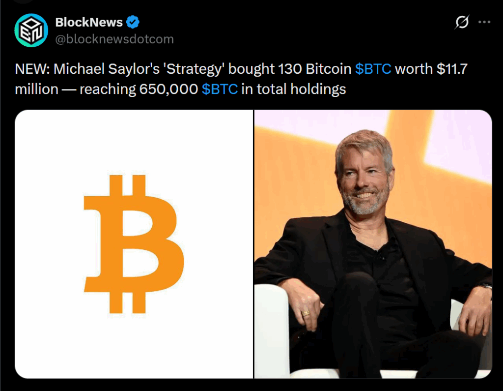- Strategy bought 130 BTC for $11.7M, bringing total holdings to 650,000 BTC worth $48.38B.