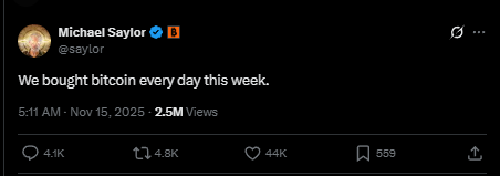 Amid the noise, MicroStrategy founder Michael Saylor once again reinforced his long-term Bitcoin strategy. In a recent televised interview, he acknowledged Bitcoin’s volatility, describing sharp drawdowns as part of the journey rather than a reason to abandon the asset. He highlighted Bitcoin’s history of deep corrections followed by strong recoveries, arguing that its long-run performance still eclipses many traditional investments. Saylor also revealed that MicroStrategy has kept buying through the turbulence, noting on X that the firm “bought Bitcoin every day this week,” signaling zero intention to slow down accumulation.