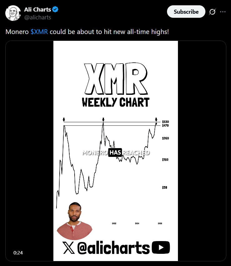 - Monero dropped 8.5% in 24 hours after months of strong outperformance.