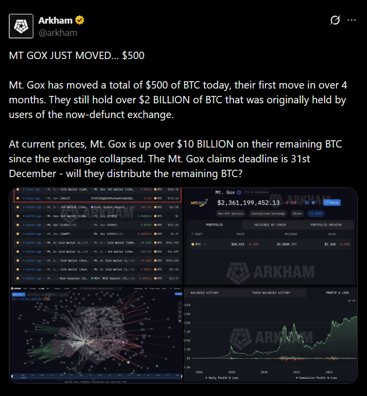 Mt. Gox still holds roughly 34,503 BTC, valued at around $2.4 billion at current prices. That’s a significant amount of supply, especially in a market that’s already sensitive to macro conditions and liquidity shifts. Even partial distribution of those coins could influence short-term price action.