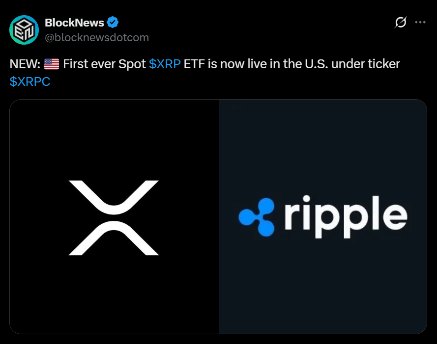 - Canary Capital’s spot XRP ETF (XRPC) officially began trading on Nasdaq today.