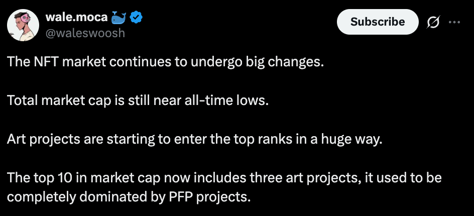 What’s more interesting is where that attention is going. Art-focused projects are starting to climb into the top rankings, something that used to be rare when profile picture collections dominated everything.