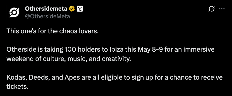 Otherside is taking the whole “NFT holder perks” idea and pushing it a step further, maybe further than most expected. Instead of just digital access or token-gated chats, 100 holders from the Yuga ecosystem are being flown out to Ibiza for a full weekend experience, and not a low-effort one either.