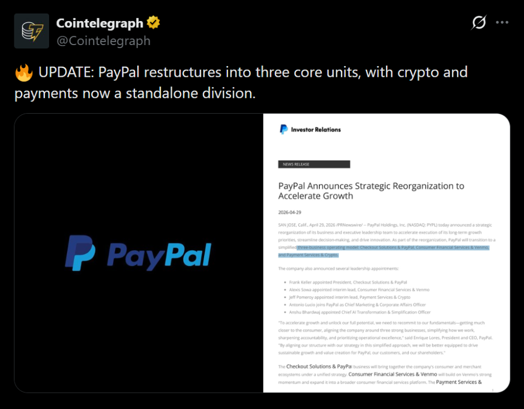 PayPal is reshuffling its entire structure, and this time, crypto isn’t sitting on the sidelines anymore. The company is moving to a simplified three-division model, and one of those divisions is explicitly built around payments and crypto.