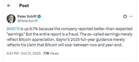 Peter Schiff, the ever-outspoken gold advocate and longtime Bitcoin critic, is back on the offensive—this time targeting Michael Saylor’s company, Strategy. After the firm released its Q3 earnings, showing a 6.7% stock jump and $2.8 billion in net income, Schiff took to X to accuse Strategy of inflating its results. He called the report “fraud,” arguing that the company’s impressive numbers only reflect unrealized Bitcoin gains rather than genuine operational profits.