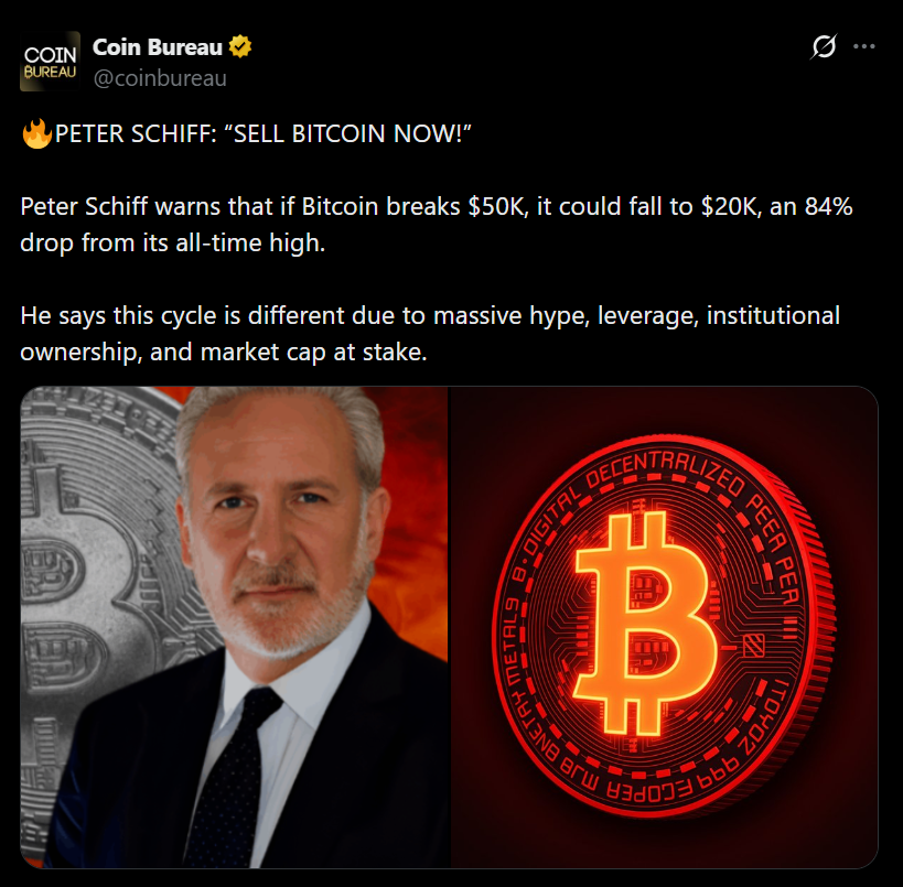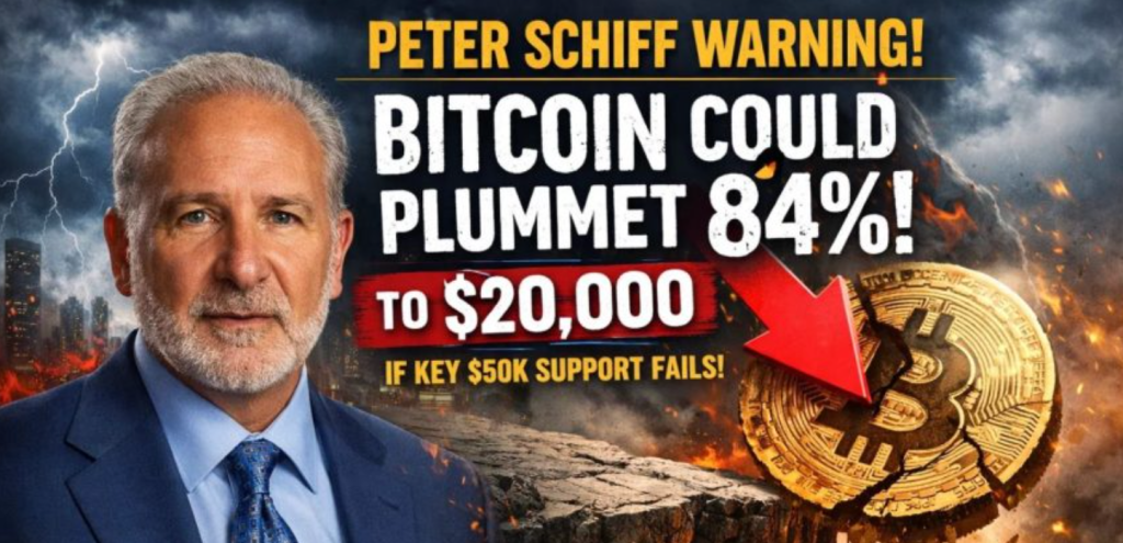 Peter Schiff has never liked Bitcoin, but his latest warning cuts even sharper than usual. He claims that if Bitcoin breaks below key support near $50,000, it could plunge toward $20,000 — roughly an 84% drop from its cycle highs. That’s not a mild correction. That’s a full reset.