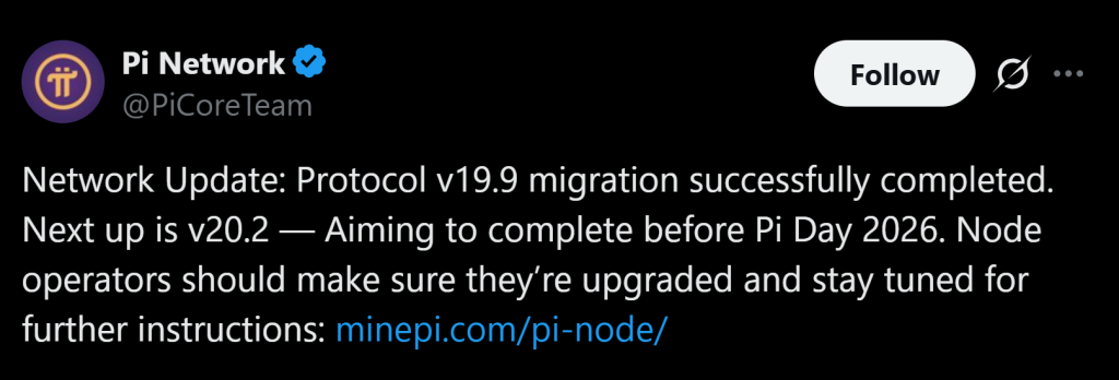 Beyond market momentum, Pi Network’s internal developments may also be supporting the price surge. The team recently confirmed a successful migration to Protocol v19.9, marking another technical milestone for the project. Developers have also stated that they aim to complete the next major upgrade, Protocol v20.2, before Pi Day on March 14, 2026.