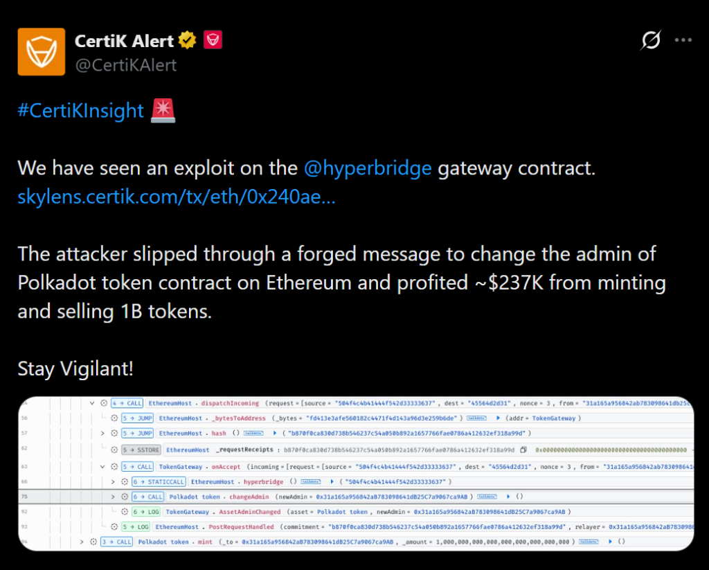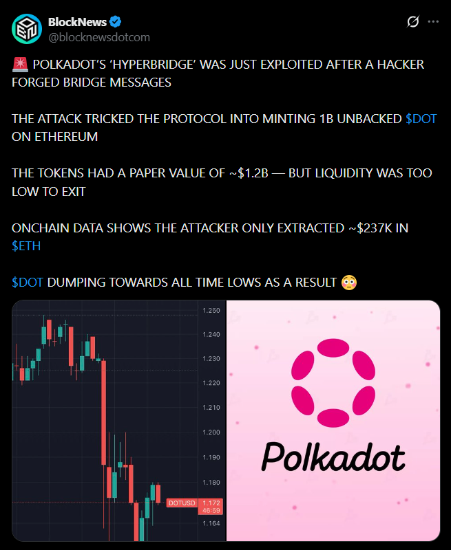 - Attackers minted up to 1 billion DOT via Hyperbridge exploit