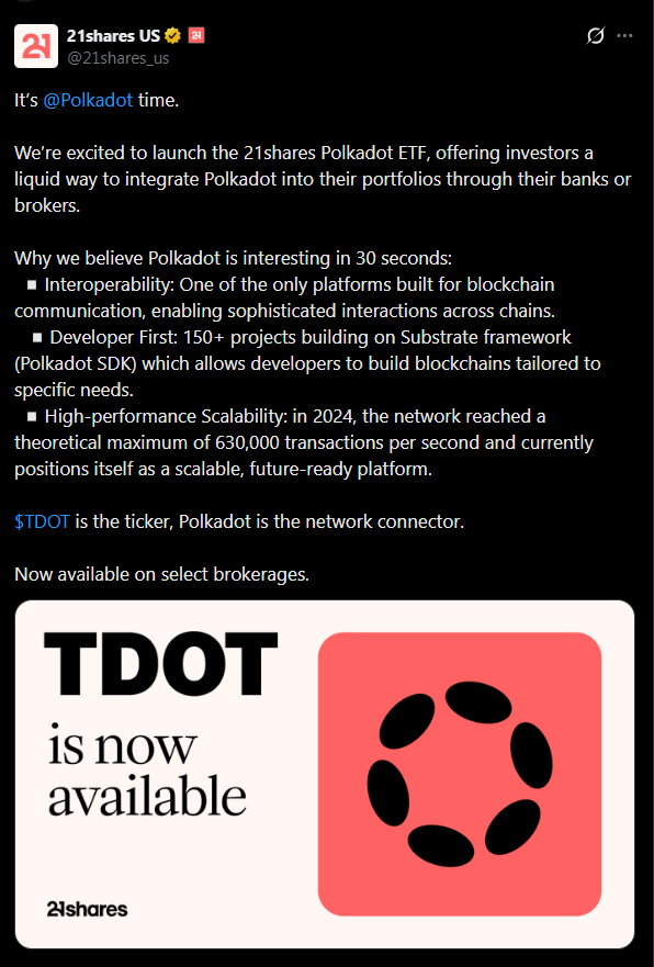 - 21Shares launched the first US spot Polkadot ETF under ticker TDOT
