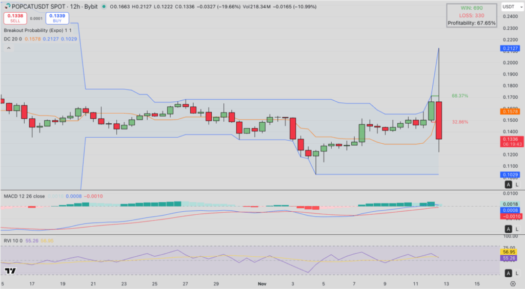 Technically, the charts look rough. Popcat was rejected at $0.2127, then dumped nearly 20% to $0.1324, leaving behind a long upper wick that screams heavy distribution. The Donchian Channel upper band acted like a ceiling, and the median line around $0.1578 flipped into resistance after the fall. Indicators aren’t helping either: the MACD histogram has been narrowing (a sign of fading bullish strength), and the RVI hanging near 56.9 suggests the market is stuck in a weird post-volatility limbo.